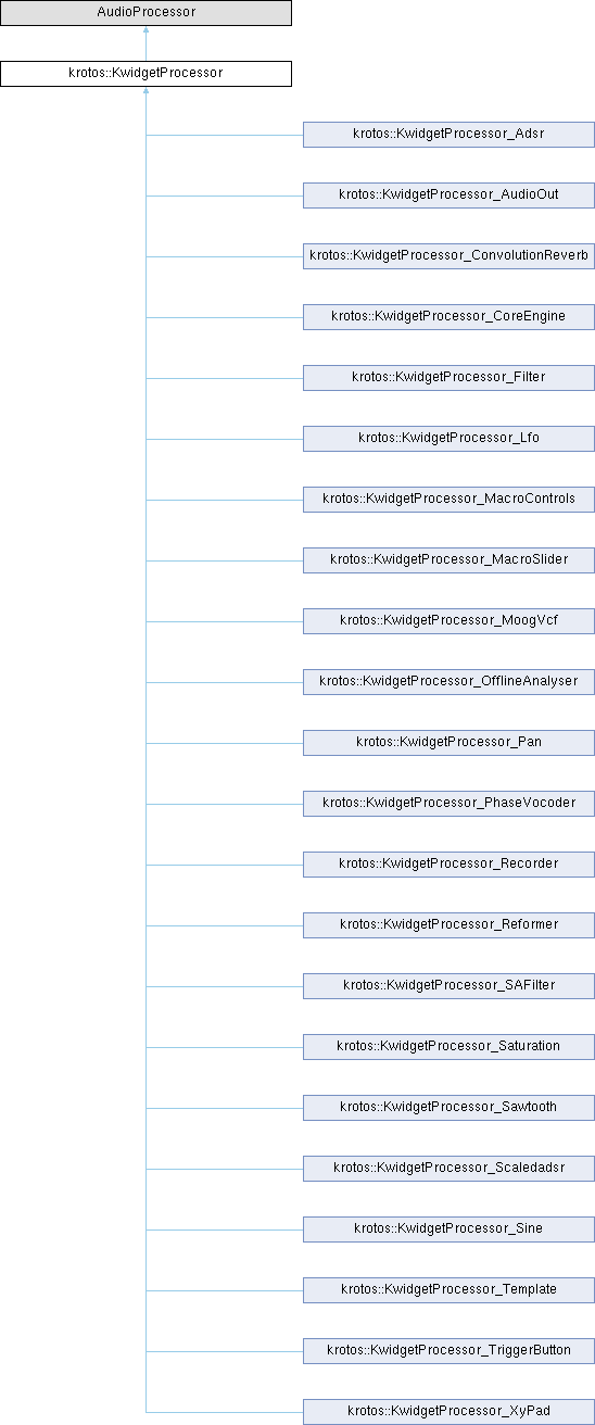Implemented in krotos::KwidgetProcessor_Adsr, krotos::KwidgetProcessor_AudioOut, krotos::KwidgetProcessor_ConvolutionReverb, krotos::KwidgetProcessor_CoreEngine, krotos::KwidgetProcessor_Filter, krotos::KwidgetProcessor_Lfo, krotos::KwidgetProcessor_MacroControls, krotos::KwidgetProcessor_MacroSlider, krotos::KwidgetProcessor_MoogVcf, krotos::KwidgetProcessor_OfflineAnalyser, krotos::KwidgetProcessor_Pan, krotos::KwidgetProcessor_PhaseVocoder, krotos::KwidgetProcessor_Recorder, krotos::KwidgetProcessor_Reformer, krotos::KwidgetProcessor_SAFilter, krotos::KwidgetProcessor_Saturation, krotos::KwidgetProcessor_Sawtooth, krotos::KwidgetProcessor_Scaledadsr, krotos::KwidgetProcessor_Sine, krotos::KwidgetProcessor_Template, krotos::KwidgetProcessor_TriggerButton, and krotos::KwidgetProcessor_XyPad.